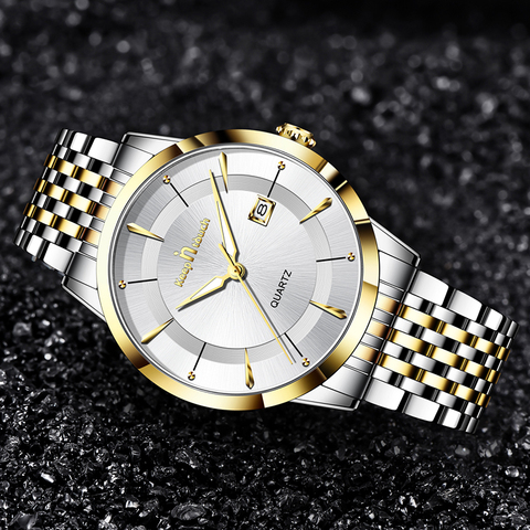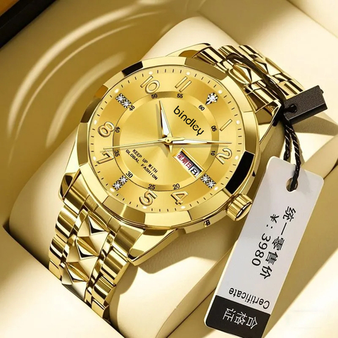 2024นาฬิกาผู้ชายแฟชั่นสีทองนาฬิกาควอตซ์สายสแตนเลสสตีลกันน้ำปฏิทินนาฬิกาข้อมือธุรกิจแบบเรียบง่าย